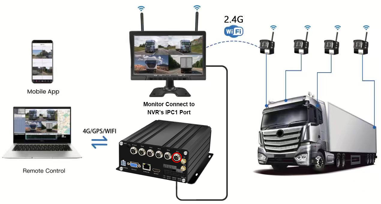 Ang relay monitor ay kumonekta sa NVR IPC port sa pamamagitan ng 6PIN aviation connector