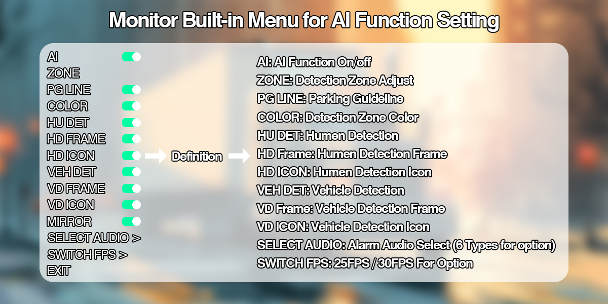 Subaybayan ang built-in na AI Calibration Menu, lahatAng mga gumagamit ay malayang ayusin ang laki ng lugar ng pagtuklas (Detect Zone) sa screen upang magkasya sa iba't ibang sitwasyon sa pagtingin na dulot ng magkaibang posisyon at anggulo ng pag-install. Sa tabi ng pagsasaayos ng lugar ng pagtuklas, mayroong higit pang AI function na nagpapahintulot sa user na baguhin ang setting (Pakisuri ang sumusunod na larawan).