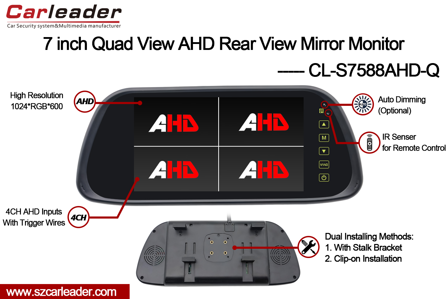 Mag-upgrade saCarleader7 Inch 4CH Quad AHD Rear View Mirror Monitor Suporta sa Dual Installationpara sa walang kapantay na visibility, pagiging maaasahan, at kapayapaan ng isip sa kalsada.