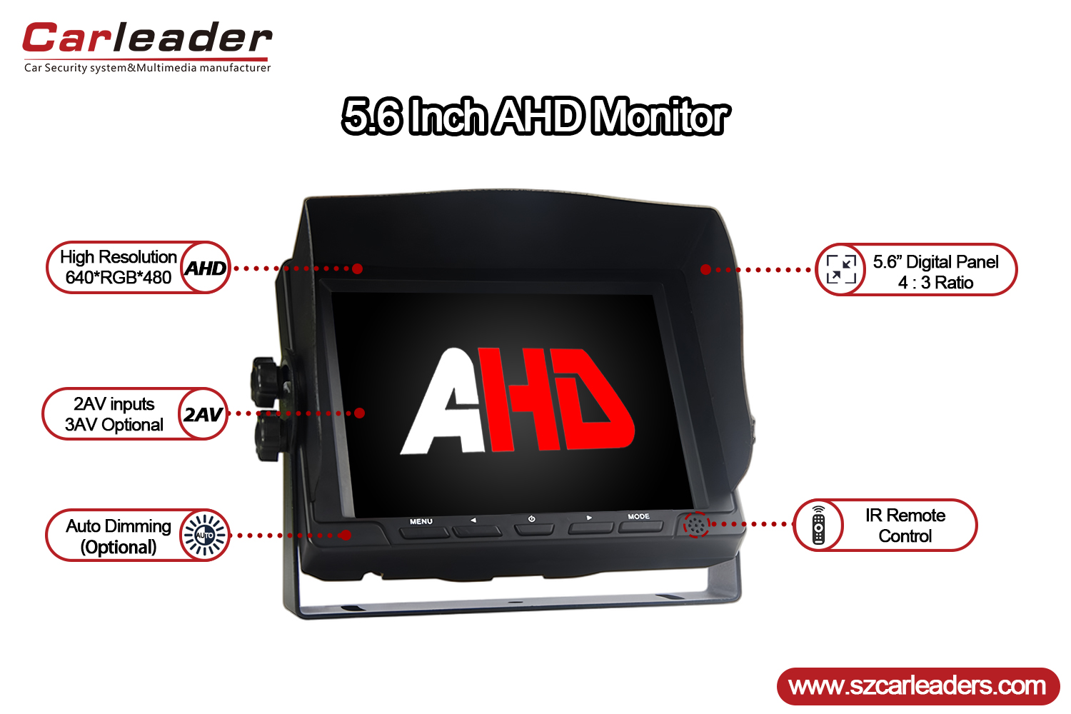 Carleader5.6 Inch 2CH AHD Inputs Vehicle Backup Monitoray isang propesyonal na grado na 5.6 pulgadaAHD rear view monitor, na idinisenyo upang maghatid ng malinaw, maaasahang imahe para sa kaligtasan ng sasakyan at mga sistema ng pagsubaybay. Nagtatampok ng modernong disenyo at matatag na functionality, ito ay isang perpektong solusyon para sa mga komersyal at pribadong sasakyan na nangangailangan ng maaasahang rear vision.