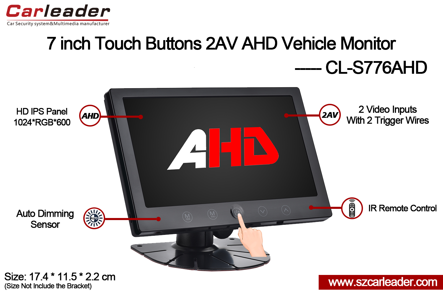 Carleader7 Inch IPS Screen 2CH AHD Input Touch Buttons Heavy Vehicle Monitorperpekto para sa automotive, seguridad, dagat, at pang-industriya na paggamit, itopinagsasama ang tibay, flexibility, at mataas na kalidad na pagganap ng display sa isang maaasahang pakete.