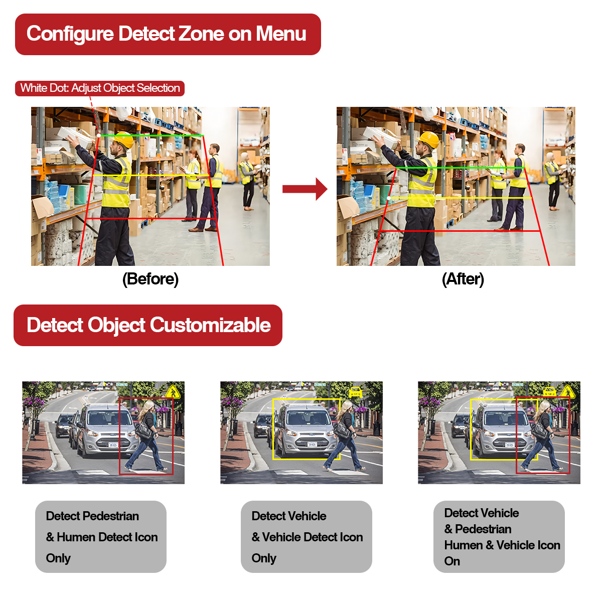 Bagong Inilunsad si CarleaderAI Blind Spot Detection Rear View Camera Built-in Sound & Light Alarm, isang cutting-dege AI camera na sumusuporta sa pedestrian at pag-detect ng sasakyan, camera na may built-in na warning light at alarm function, ay maaaring gumana kasama ng iyong monitor, maaari ding magkasya sa aming AI monitor na sumusuporta sa AI calibration, nagbibigay-daan upang ayusin ang laki ng detection zone ng camera at iba pang AI function.