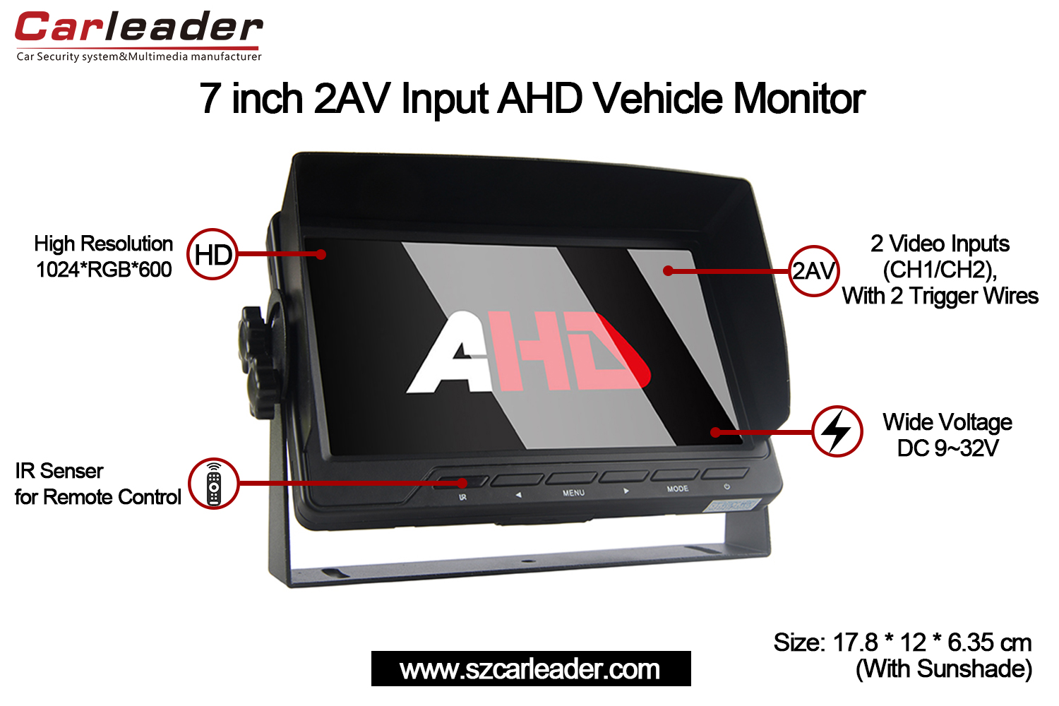 Carleader7 Inch AHD 2CH Input Vehicle Monitoray isang Car AHD Monitor na idinisenyo upang maghatid ng malinaw, maaasahang pagpapakita ng video para sa mga aplikasyon ng komersyal at pribadong sasakyan. Binuo gamit ang isang mataas na kalidad na digital panel at sumusuporta sa mga advanced na AHD video input, tinitiyak ng monitor na ito ang mahusay na visibility at kadalian ng paggamit sa iba't ibang mga kondisyon sa pagmamaneho.