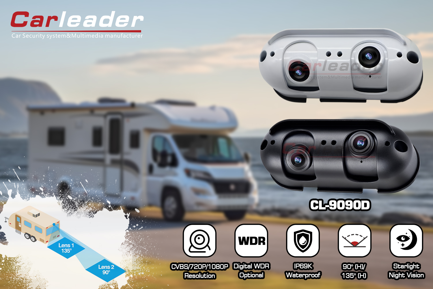 CarleaderAHD Starlight Dual Lens Rear View Camera fit Para sa RV Motorhome, isang pribadong tooling AHD rear view camera mula kay Carleader, ang disenyo ng dual lens ay nagbibigay-daan sa user na magkaroon ng malinaw na visibility performance ng malapit at malayong rearview sight. Ang aluminum alloy housing at IP69K rating nito ay ginagawang mas matibay at matibay ang camera sa anumang malupit na lagay ng panahon. Ang kamera na ito ay hindi lamang akma para sa mabigat na tungkuling sasakyan, tulad ng trak, bus, forklift, atbp; angkop din para sa motorhome na sasakyan, tulad ng RV at caravan.