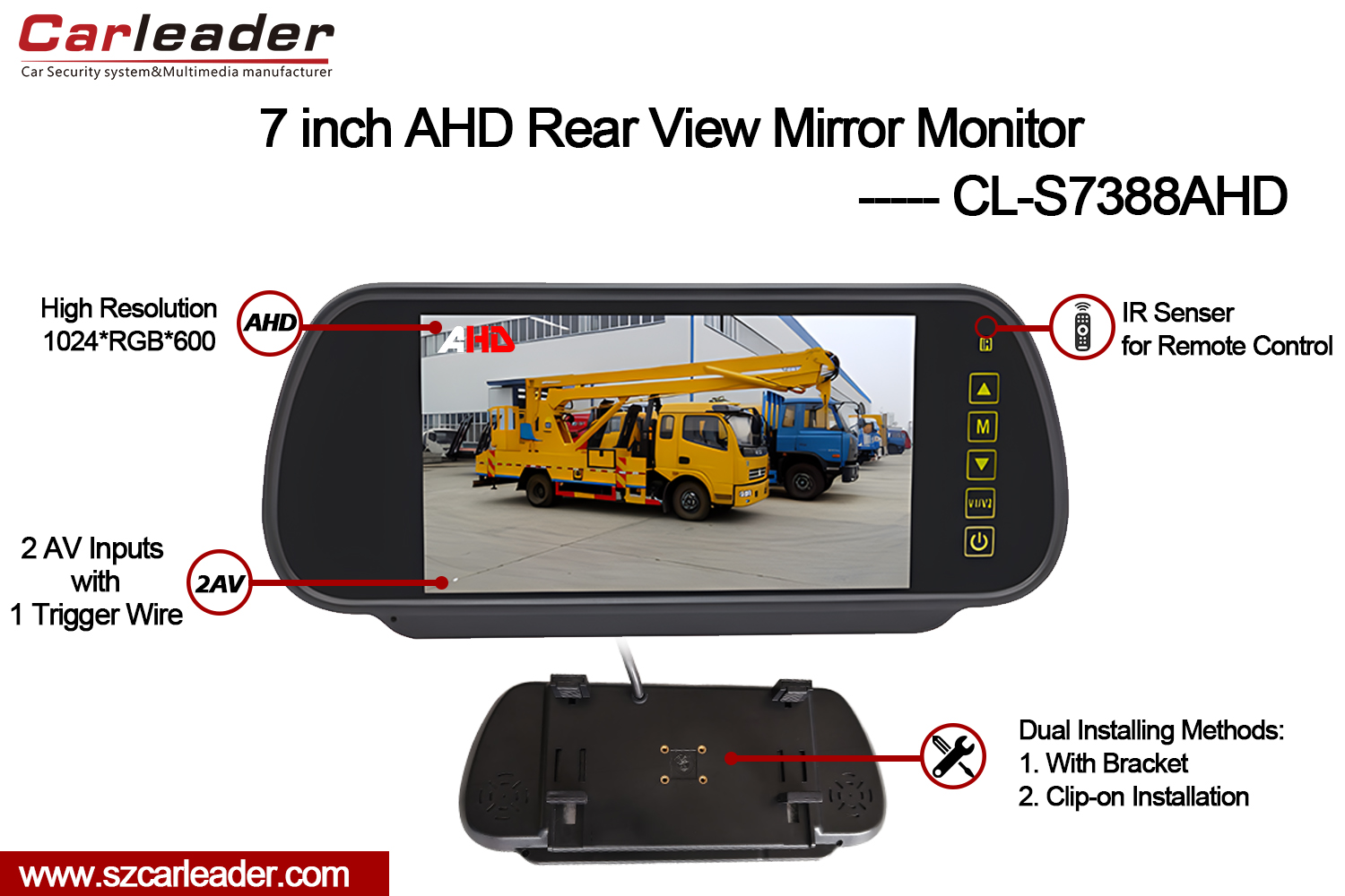 Carleader7 Inch TFT LCD Rear View Mirror AHD Monitoray isang high-performance na 7-inch car mirror AHD monitor na idinisenyo upang maghatid ng pambihirang kalinawan at versatility para sa mga modernong sistema ng pagmamanman ng sasakyan. Pinagsasama ang mga advanced na feature sa user-friendly na disenyo, tinitiyak ng monitor na ito ang maaasahang performance sa magkakaibang kondisyon sa pagmamaneho.